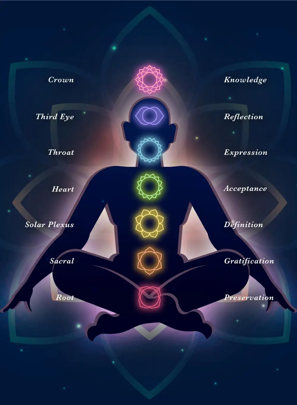 Just as our journey brings us from ignorance, through spiritual exploration, to Enlightenment, the lotus begins life in the mud, rises through the water to bloom in the sunlight. The Chakras are most commonly expressed as lotus flowers with a varying number of petals.
